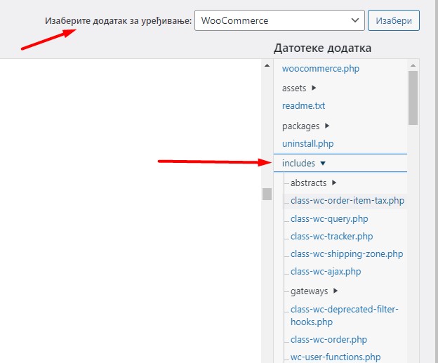 Odaberite dodatak za uređivanje WooCommerce i kliknite na Includes folder.